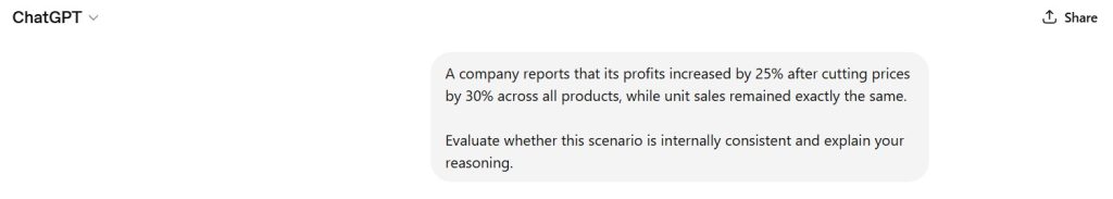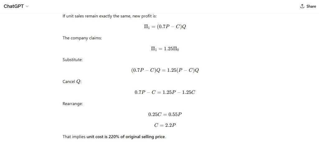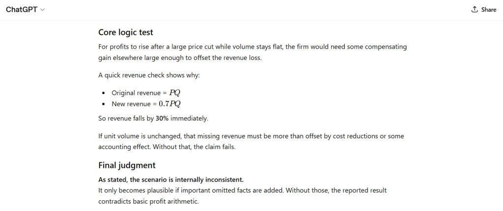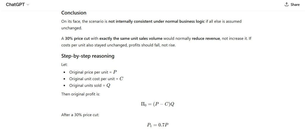A company reports that its profits increased by 25% after cutting prices by 30% across all products, while unit sales remained exactly the same.