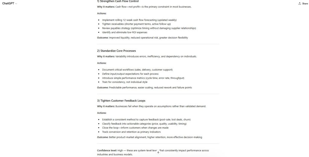 The output demonstrates strong capability in structured business reasoning under ambiguous conditions.