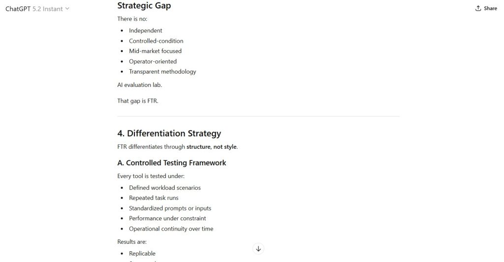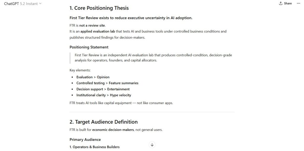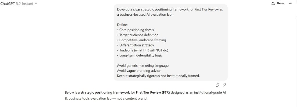 Develop a clear strategic positioning framework for First Tier Review as a business-focused AI evaluation lab.
