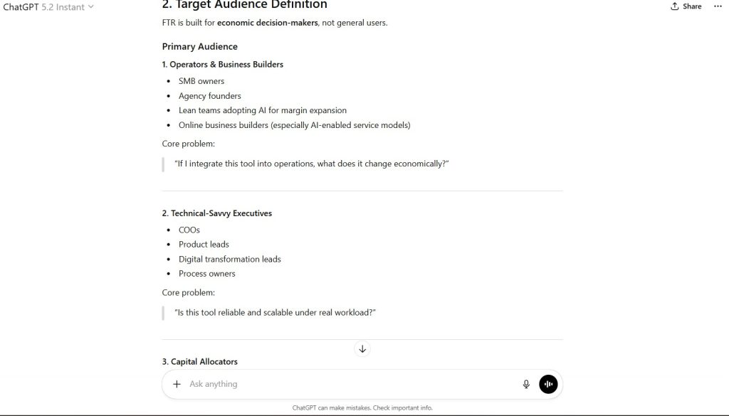 It produces a Target Audience Definition aligned to economic decision-makers, applies Competitive Landscape Framing through categorical decomposition, and articulates a Differentiation Strategy grounded in structural separation rather than narrative positioning.