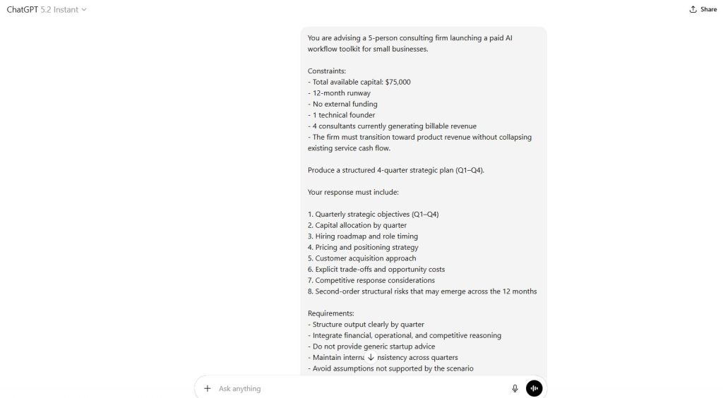 This assessment evaluates ChatGPT 5.2 Instant as the reference model under First Tier Review Methodology (v1.0).