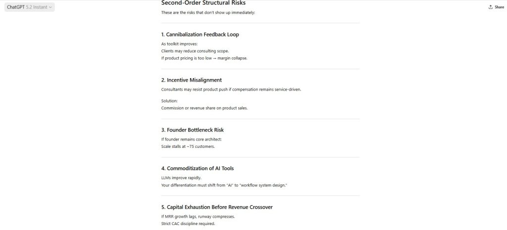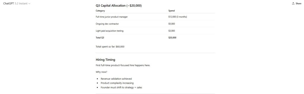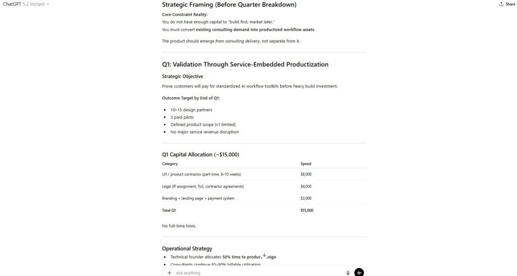 The strategic plan progresses sequentially from early validation to product stabilization while preserving the consulting revenue engine during the transition phase. Capital allocation is staged logically across quarters, and hiring decisions are tied to validation milestones rather than assumed growth.