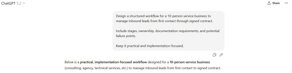 Design a structured workflow for a 10-person service business to manage inbound leads from first contact through signed contract.