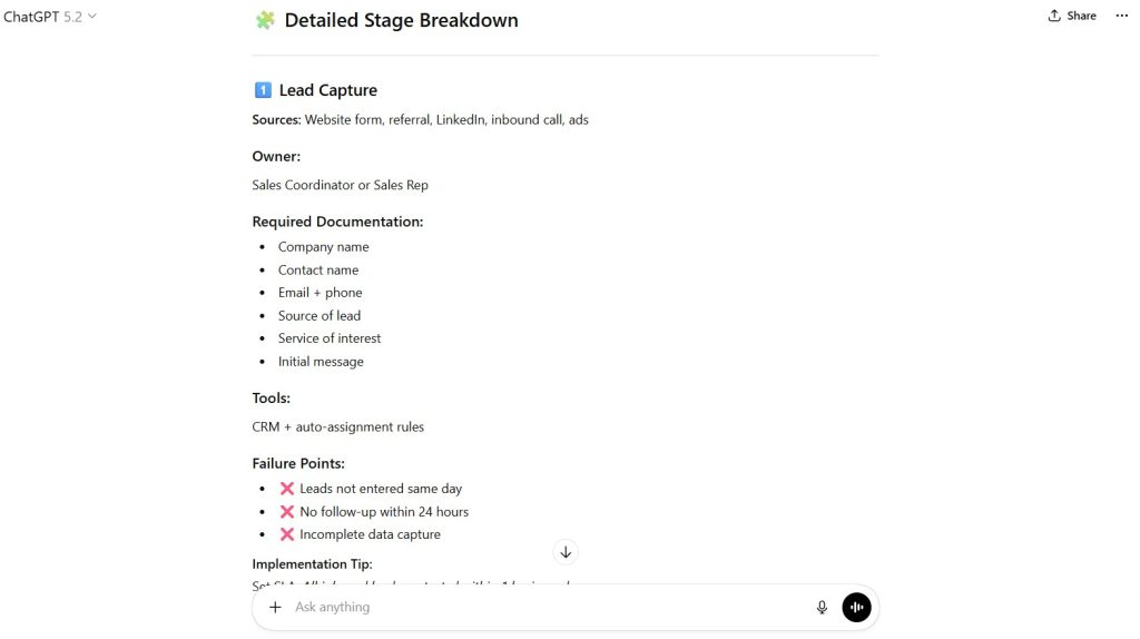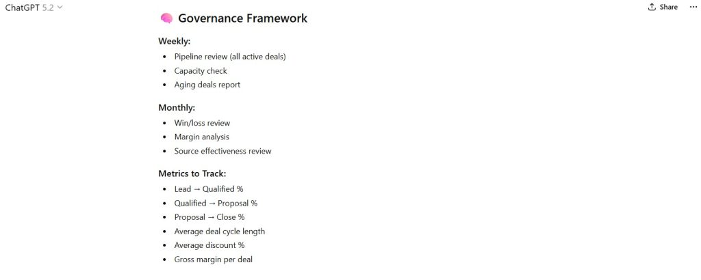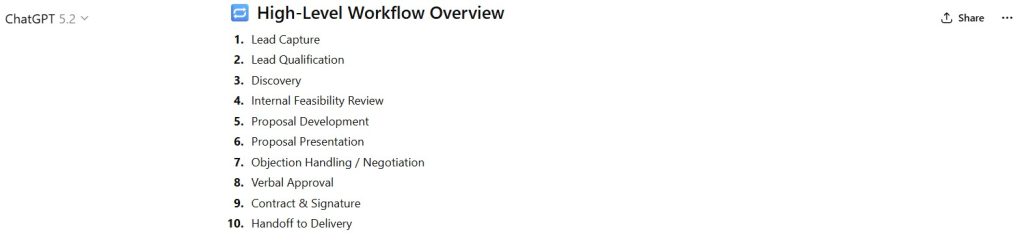 It reliably sequences commercial stages from inbound lead through executed contract, assigns ownership layers, defines documentation standards, and establishes measurable exit criteria.